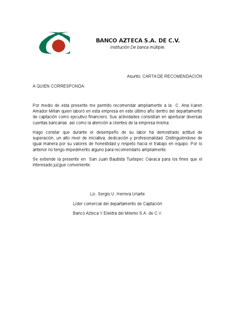 Institucin de Banca Mltiple. Carta De Recomendacion Banco Azteca By xenapita Sunday August 25 2019.