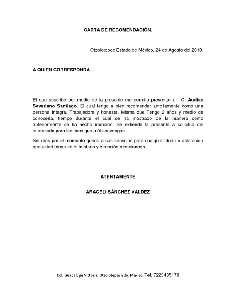 Puedes utilizar esta muestra o machote de carta de recomendacin laboral como modelo. De hecho te mostramos todas las plantillas y formatos en lnea de carta de referencias personal en formato PDF Word y Google Docs Drive.