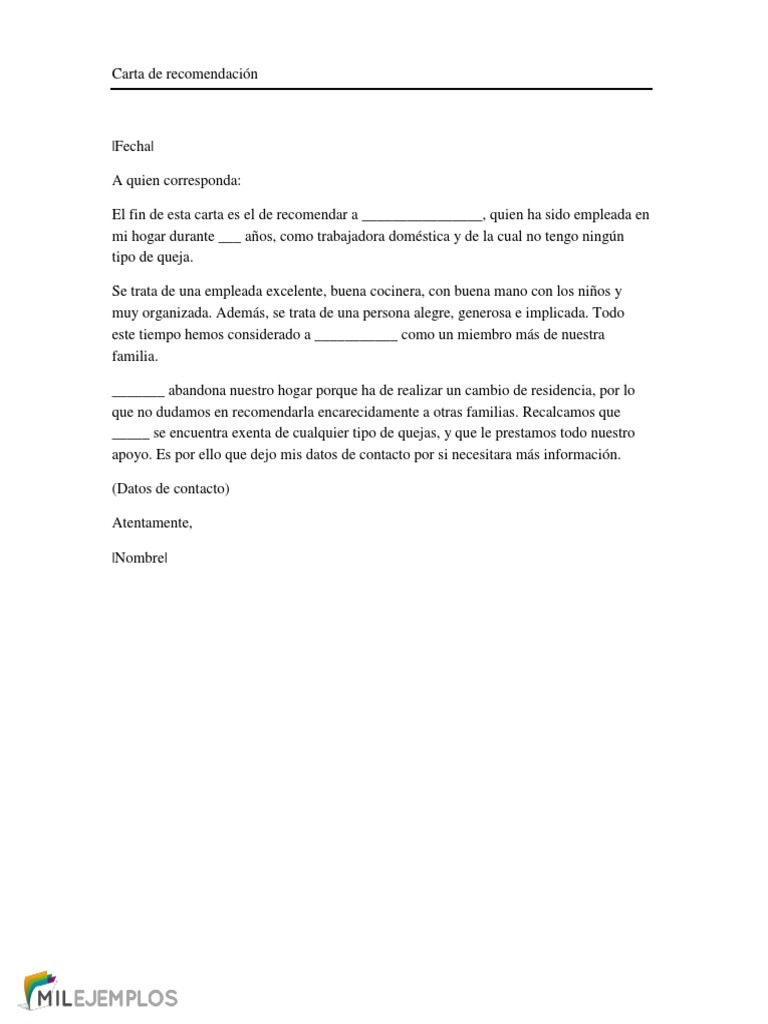 En esta gua te mostrar cmo hacer una carta de recomendacin profesional para que sepas qu hacer cuando un colega o ex empleados te soliciten una. No son estrictamente solo mujeres pueden ser hombres los que realizan este trabajo. La carta de recomendacin para empleada domstica suele escribirse cuando se requiere ingresar a un trabajo domstico la llegan a escribir personas conocidas pero generalmente es escrita por alguien que ya ha empleado antes a la persona.